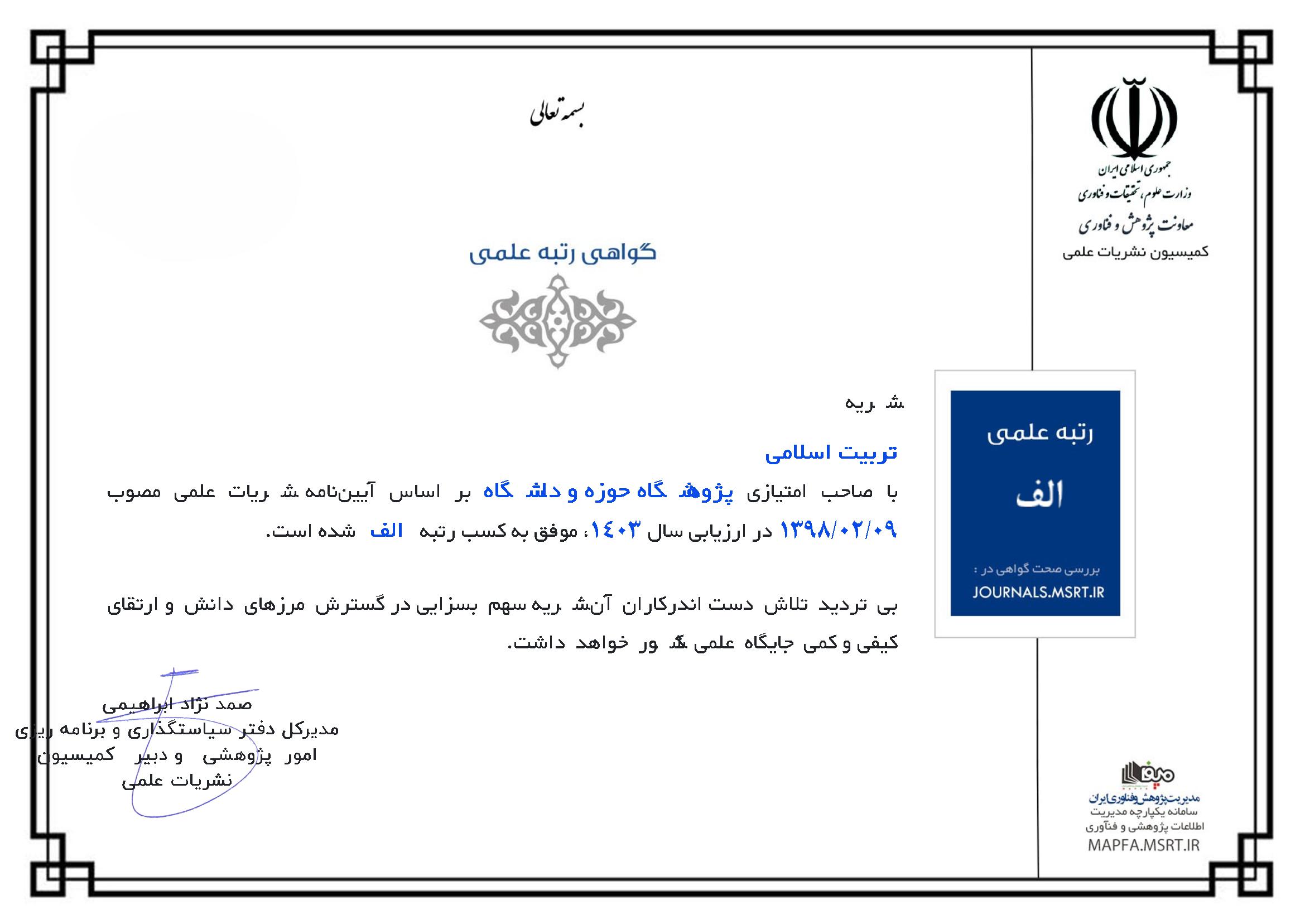 کسب رتبه «الف» توسط نشریه «تربیت اسلامی» در ارزیابی کمیسیون نشریات وزارت عتف