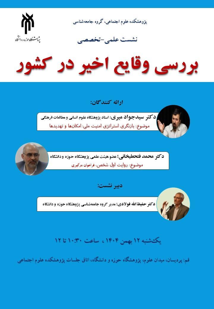 نشست علمی-تخصصی «بررسی وقایع اخیر در کشور» توسط گروه جامعه شناسی پژوهشکده علوم اجتماعی پژوهشگاه حوزه و دانشگاه برگزار میشود